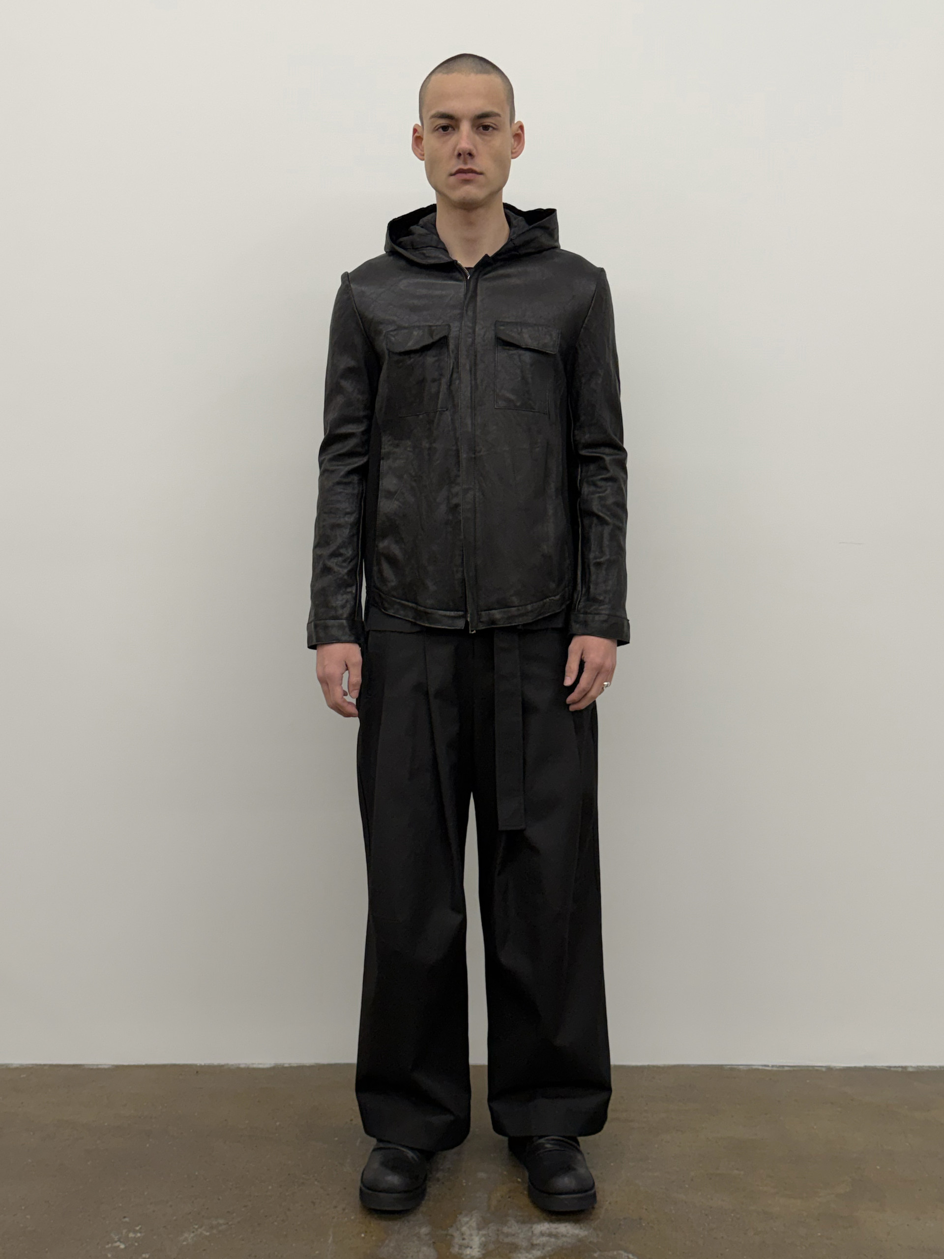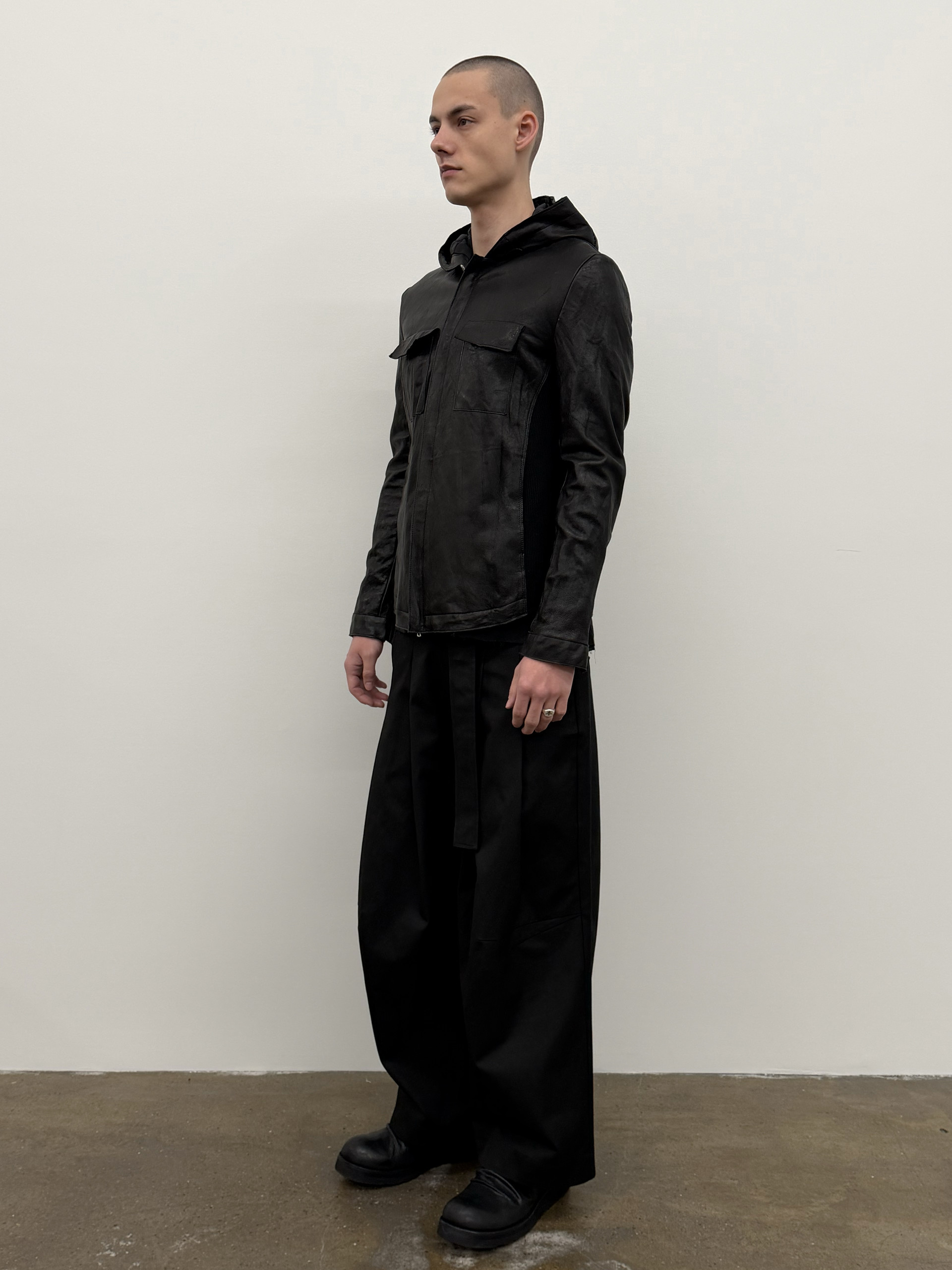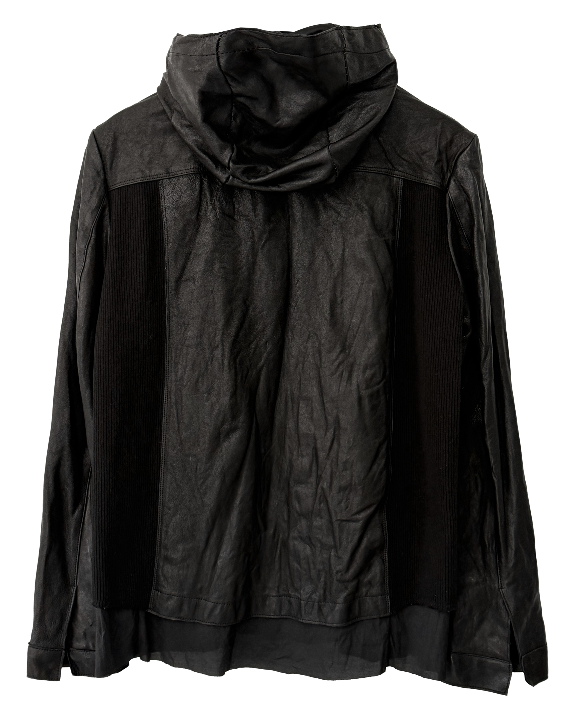 Hand-washed hooded leather jacket with open Riri® two-way zipper.