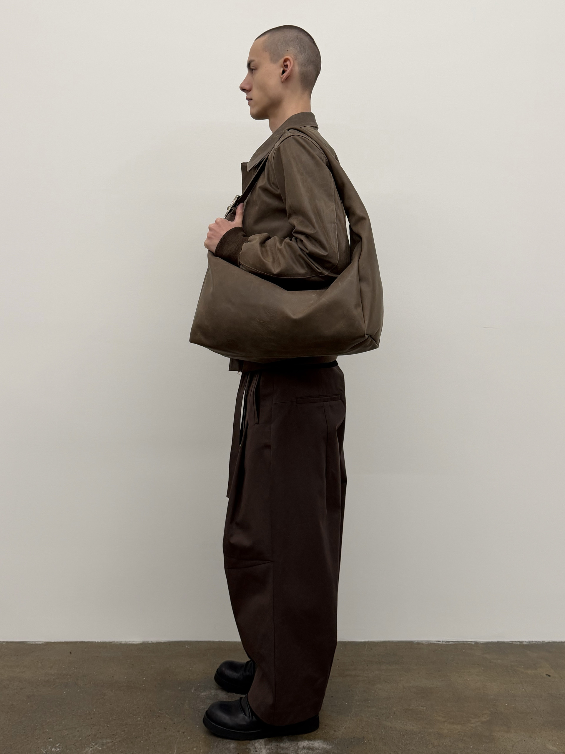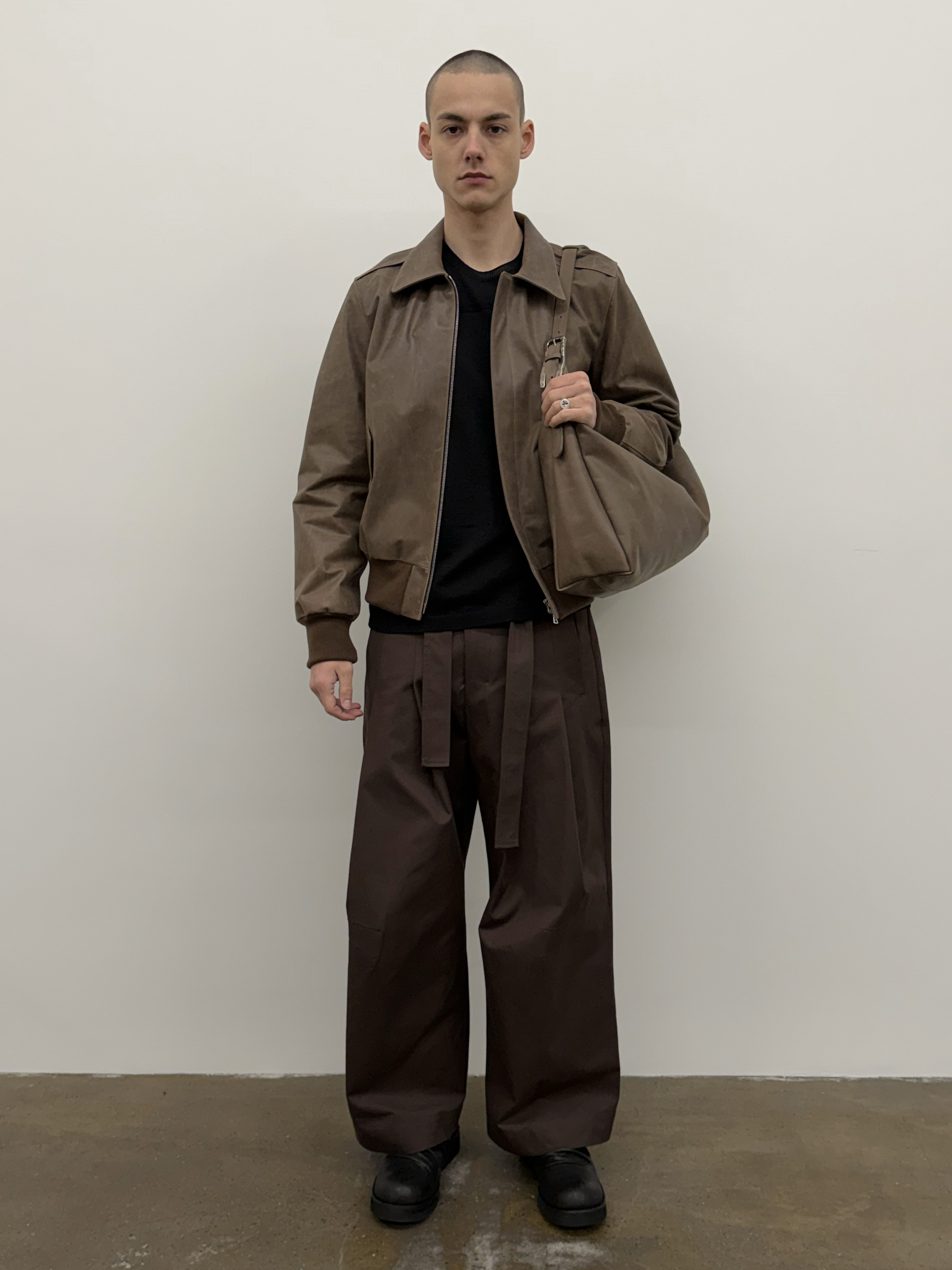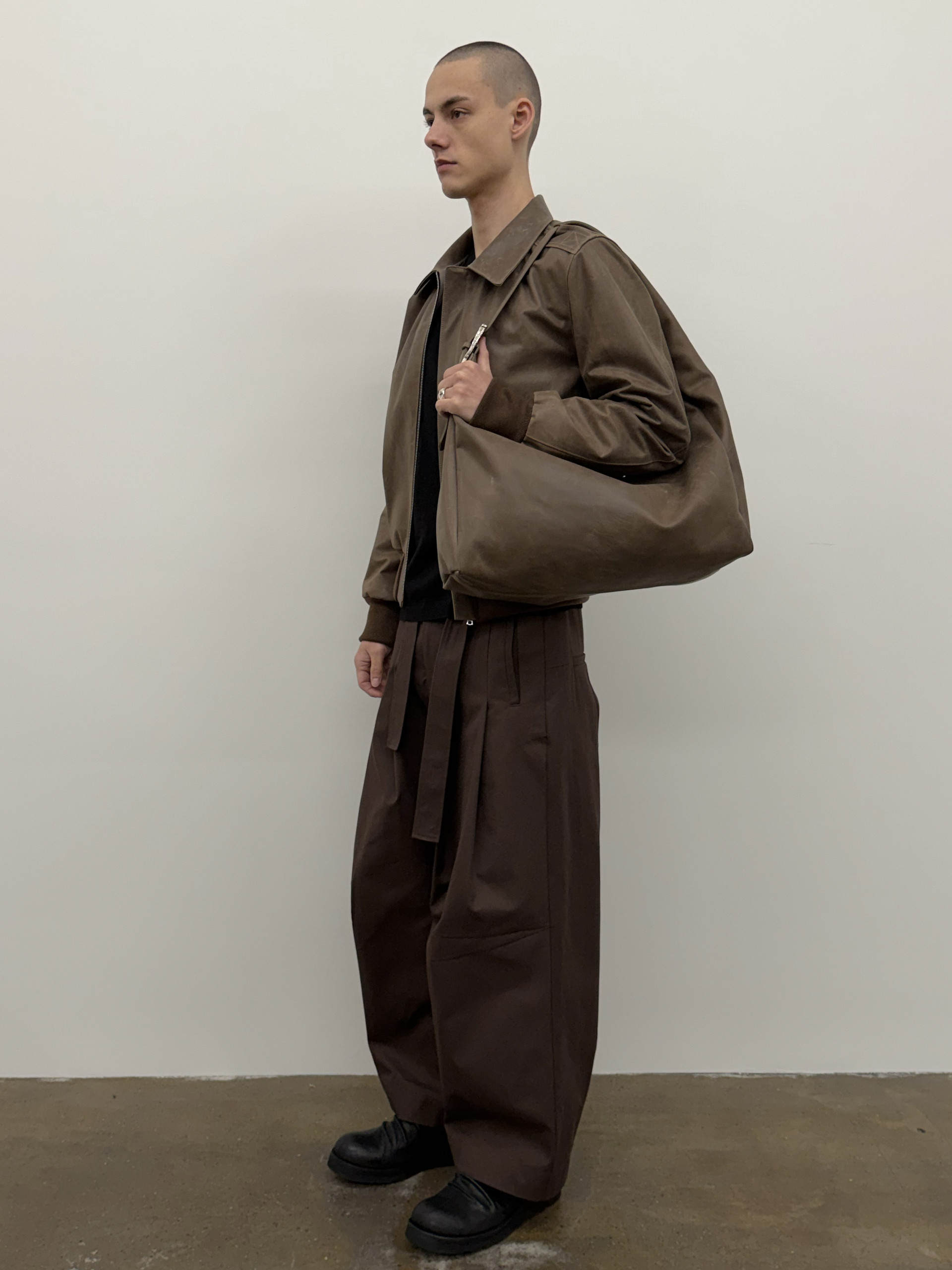 Waxed cowhide A-2 jacket with visible waxed texture.