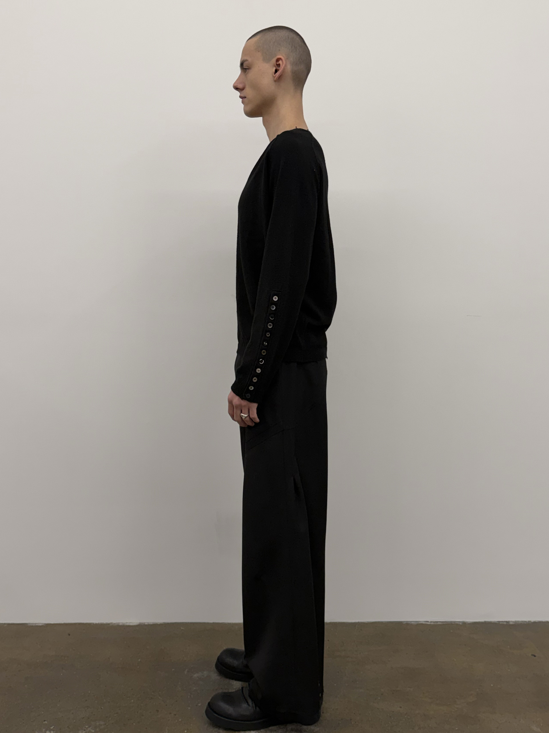 Asymmetrical signature sleeve buttons.